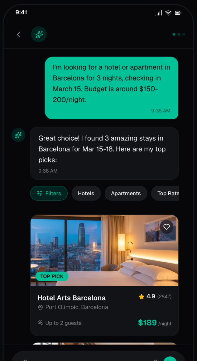 Structured data and APIs that let AI booking agents discover availability, check rates, and submit booking requests directly. Get in front of guests before they even open a browser.